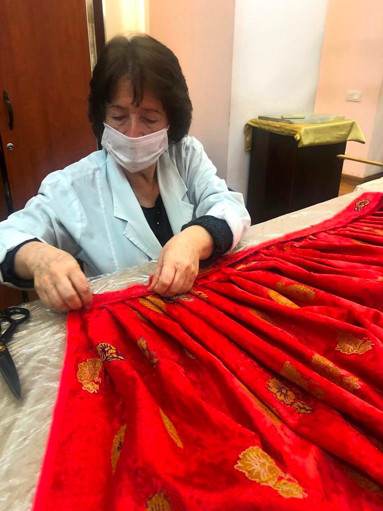 Üzeyir Hacıbəylinin anası Şirin xanım Əliverdibəyovaya məxsus milli toy geyiminin üzərində aparılan son tamamlanma prosesini təqdim edirik